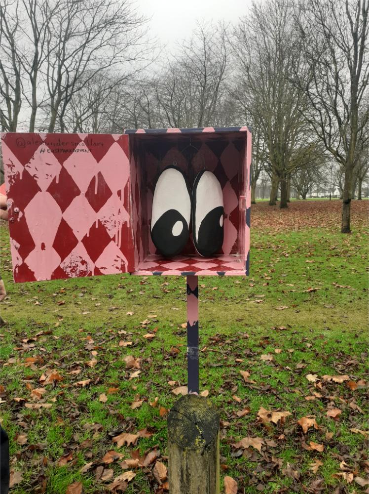 Wood, gloss paint, acrylic paint, emulsion paint, galvanised steel wire, polyurethane foam, copper coated handle and fixings